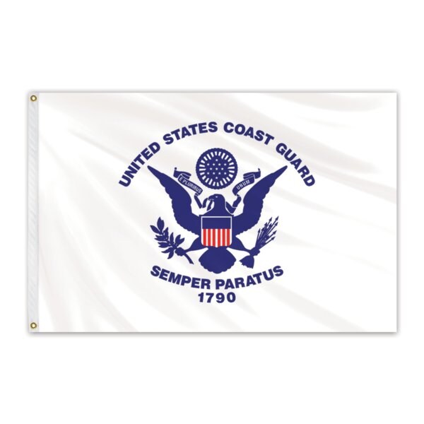 Unsurpassed in beauty and craftsmanship, these nylon outdoor flags are manufactured to precise specifications. The United States Coast Guard Outdoor Nylon Flag is made with heavyweight 200-denier nylon material, which is expertly crafted and specially treated to resist sun and chemical deterioration. This high quality flag is ideal for outdoor use. The United States Coast Guard Flag features a dark blue Great Seal of the United States on a white field. Inscribed in an arc above the seal is “United States Coast Guard” and below the seal is “Semper Paratus” and beneath that, is the number “1790”.