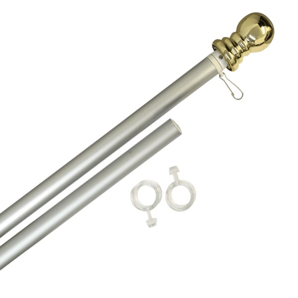 Display the flag beautifully with this Aluminum Rotating Pole Kit. The pole rotates to prevent the flag from wrapping around the pole in the wind. \nThis pole is 6’ long with a 1” diameter. Kit comes complete with a Gold ball ornament, and two EZ- Mount Rings. \nSilver finish. \nFlag and bracket not included. \n
