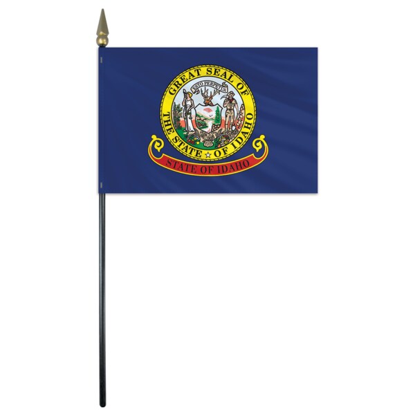 Beautifully printed on silk-like Endura-GlossTM and Endura-PolyTM material, stick flags are carefully hem-stitched on all four sides and mounted on a staff with spear. The state flag of Idaho consists of the state seal on a blue background. The state seal of Idaho was designed by Emma Edwards Green; she is the only woman to ever design a state seal. The seal was adopted around 1863.