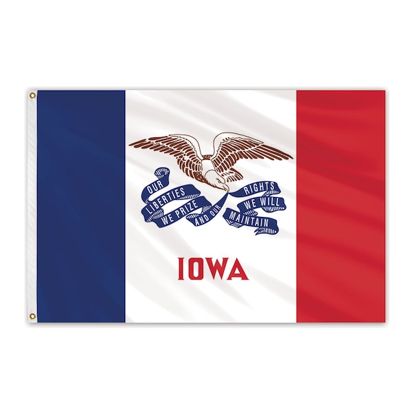 Recognized as the most durable of all flag fabrics, our Poly-MaxTM state flags are skillfully crafted of 2-ply 100% polyester bunting. Its open weave construction reduces wind resistance, therefore lessening abrasion and increasing flag life. This flag material is ideal for industrial and institutional application because it resists wear to wind, dirt, and moisture. Designed specifically for the needs of the most discriminating customer, this flag will prove to be the most durable, longest lasting flag available. All Poly-MaxTM flags are finished with a snow-white header and brass grommets. The Iowa state flag was designed by Dixie Cornell Gebhardt in 1917. The vertical stripes of the flag refer to Iowa's history as part of the French Louisiana Territory.