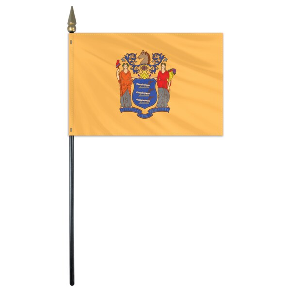 Beautifully printed on silk-like Endura-GlossTM and Endura-PolyTM material, stick flags are carefully hem-stitched on all four sides and mounted on a staff with spear. The New Jersey state flag consists of the state coat of arms centered against a buff-colored background. Both the state seal and coat of arms pay tribute to the formerly agricultural lifestyle of the residents of the state.