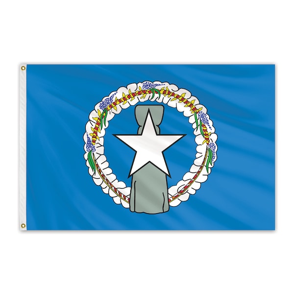 Unsurpassed in beauty and craftsmanship, these nylon outdoor flags are manufactured to precise specifications. Expertly crafted using 100% heavyweight, 200-denier nylon bunting, and treated to resist sun and chemical deterioration. Extremely durable and fast drying, nylon flags are the most popular choice for outdoor flags. All nylon flags are finished with a strong, durable snow-white header and brass grommets. The United States territory of the Northern Marianas’ flag was adopted in July 1985. The Flag features a white star on a blue field. Behind the white star, there is a symbol made of latte stone, a Chamorro house foundation.