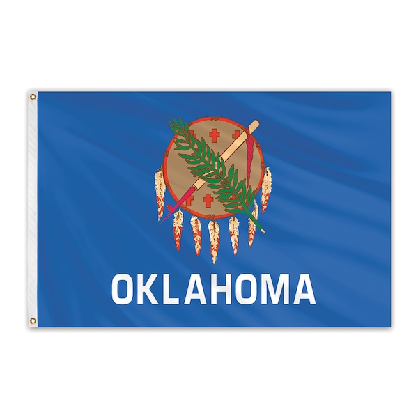 Unsurpassed in beauty and craftsmanship, these nylon outdoor flags are manufactured to precise specifications. Expertly crafted using 100% heavyweight, 200-denier nylon bunting, and treated to resist sun and chemical deterioration. Extremely durable and fast drying, nylon flags are the most popular choice for outdoor flags. All nylon flags are finished with a strong, durable snow-white header and brass grommets. The seal on the Oklahoma state flag is a symbol of peace between the original Native American inhabitants, and European American settlers. The brown crosses seen in the seal actually represent stars in Native American culture.