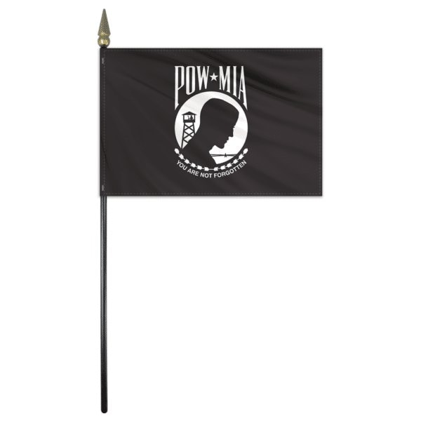 Beautifully printed on silk-like Endura-GlossTM material, stick flags are carefully hem-stitched on all four sides and mounted on a staff with spear. The POW MIA flag is black, bearing in the center, in black and white, the emblem of the League. The emblem is a white disk bearing in black silhouette the bust of a man, watch tower with a guard holding a rifle, and a strand of barbed wire; above the disk are the white letters POW and MIA framing a white 5-pointed star; below the disk is a black and white wreath above the white motto YOU ARE NOT FORGOTTEN.