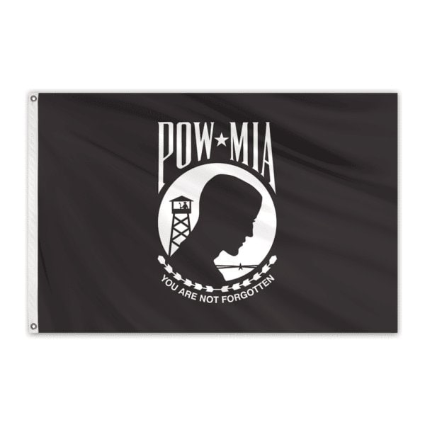 This POW-MIA Outdoor Poly Max Flag is skillfully crafted with 2-ply 100% polyester bunting. The open weave construction reduces wind resistance, lessening abrasion and increasing flag life. The extremely durable flag material is ideal for industrial and institutional applications; resists wear from dirt and moisture. The flag is finished with canvas header and brass grommets for easy installation. The POW-MIA flag is black, bearing in the center, in black and white, the emblem of the League. The emblem is a white disk bearing in black silhouette the bust of a man, watch tower with a guard holding a rifle, and a strand of barbed wire; above the disk are the white letters POW and MIA framing a white 5-pointed star; below the disk is a black and white wreath above the white motto YOU ARE NOT FORGOTTEN. Select size option below.