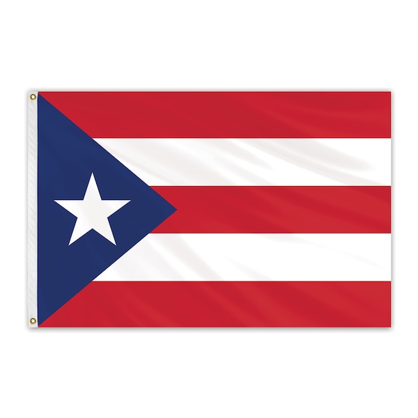 Unsurpassed in beauty and craftsmanship, these nylon outdoor flags are manufactured to precise specifications. Expertly crafted using 100% heavyweight, 200-denier nylon bunting, and treated to resist sun and chemical deterioration. Extremely durable and fast drying, nylon flags are the most popular choice for outdoor flags. All nylon flags are finished with a strong, durable snow-white header and brass grommets. The flag of Puerto Rico is five equal horizontal bands of red (top and bottom) alternating with white; a blue isosceles triangle based on the hoist side bears a large, white, five-pointed star in the center.