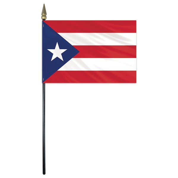 Beautifully printed on silk-like Endura-GlossTM and Endura-PolyTM material, stick flags are carefully hem-stitched on all four sides and mounted on a staff with spear. The flag of Puerto Rico is five equal horizontal bands of red (top and bottom) alternating with white; a blue isosceles triangle based on the hoist side bears a large, white, five-pointed star in the center.