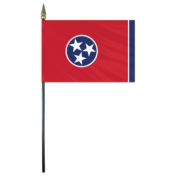 Beautifully printed on silk-like Endura-GlossTM and Endura-PolyTM material, stick flags are carefully hem-stitched on all four sides and mounted on a staff with spear. The Tennessee state flag was created by Colonel LeRoy Reeves of the Tennessee National Guard in the early 1900's. The three stars in the middle of the flag represent the main divisions of the state: East Tennessee, Middle Tennessee, and West Tennessee.