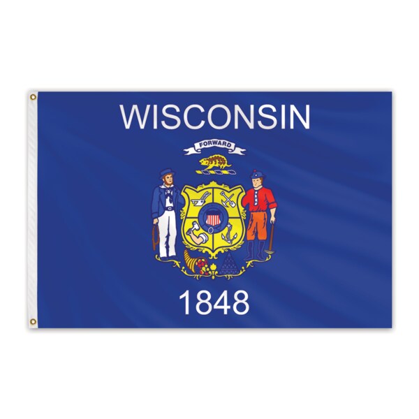 Unsurpassed in beauty and craftsmanship, these nylon outdoor flags are manufactured to precise specifications. Expertly crafted using 100% heavyweight, 200-denier nylon bunting, and treated to resist sun and chemical deterioration. Extremely durable and fast drying, nylon flags are the most popular choice for outdoor flags. All nylon flags are finished with a strong, durable snow-white header and brass grommets. The flag of the state of Wisconsin features the state coat of arms on a blue field. The word “Wisconsin” appears above the seal, and the date “1848” appears below the seal. This flag was adopted on May 1st, 1981.