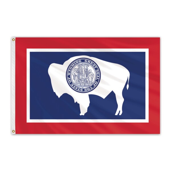 Unsurpassed in beauty and craftsmanship, these nylon outdoor flags are manufactured to precise specifications. Expertly crafted using 100% heavyweight, 200-denier nylon bunting, and treated to resist sun and chemical deterioration. Extremely durable and fast drying, nylon flags are the most popular choice for outdoor flags. All nylon flags are finished with a strong, durable snow-white header and brass grommets. The flag of the state of Wyoming features the state seal branded on a White bison. The bison is centered on a blue field, bordered in white and red. This flag was adopted on March 4th, 1917.