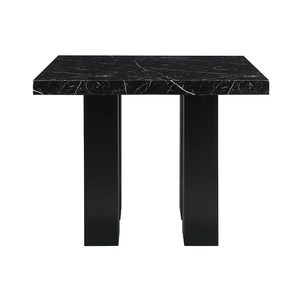 Black Faux marble counter table design with an extra thick top and a double pedestal base with silver connectors.