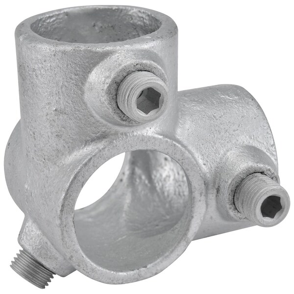 Strong iron material includes a galvanized finish for corrosion resistance and long term use. 90 Degree Two Socket Tee Pipe Fitting provides a corner joint for the middle rail of guard railing and other pipe-based structures. Upright passes through the socket tee for precise placement of the middle rail. Fitting locks onto pipe with hardened set screws included for secure connection.