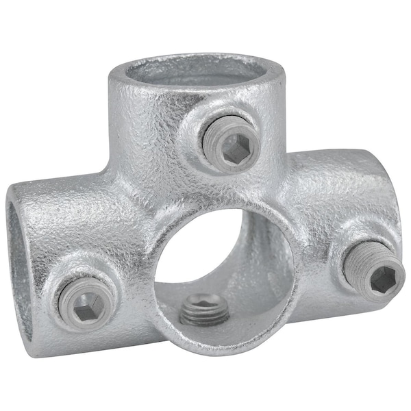 Pipe fittings are made from galvanized iron for long lasting durability and corrosion resistance. Side Outlet Tee Pipe Fitting is frequently used to join an upright with three horizontal pipes when building racking, structural framework or hand rail systems. Upright passes through the side outlet tee for precise placement of each horizontal rail. Fitting locks onto pipe with hardened set screws included for secure connection.