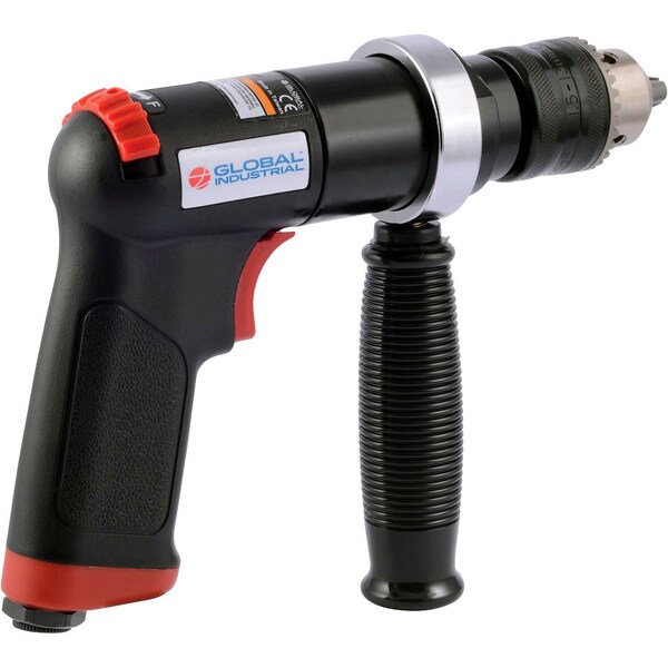 Composite Reversible 1/2 Drive Air Drill provides the power you need with low noise and excellent ergonomic comfort. Its 1/2 Jacob's-keyed chuck offers positive & secure gripping strength for bits that won't slip or come out during use. The drill has variable-speed for pin-point control and is exhausted through the handle, so particles are not directed back at your face for improved safety.