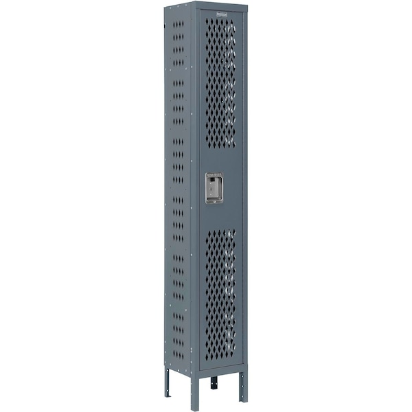 Ventilated lockers are made using heavy 16 gauge steel with diamond shaped perforations for improved airflow. Locker doors feature rubber bumpers on framing to ensure quiet operation. Continuous piano hinges provide maximum security. Recessed handle and finger-lift control creates a clean, neat appearance. Lockers include blank number plates. Gray Powder coat color finishes. Steel lockers feature finished sides; no need for decorative end panels. Single Tier Steel Gym Lockers have secure 3-point positive locking system, hat shelf, stainless steel door latch and double and single-prong coat hooks. Legs add 6 to overall height.