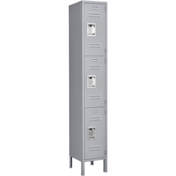 Features 16 gauge steel doors, 5-knuckle security hinge and welded, reinforced frame-and-door assemblies for maximum security. These triple tier lockers have a secure 2-point positive locking system and double and single-prong coat hooks. Generously sized louvers promote ventilation. Legs add 6 to height. Durable, attractive powder coat finish. Includes blank number plates. Lockers feature finished sides; no need for decorative end panels. Lockers must be anchored securely to floors. 1-wide and 3-wide lockers have four foot plates included. Foot plates bolt to outside locker leg supports and maybe anchored to the floor. Anchors sold separately.