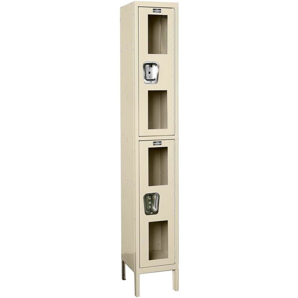 Engineered specifically for use in school, commercial and factory facilities. Legs add 6 to height. These Double Tier Locker doors feature steel with polycarbonate windows and are equipped with stainless steel recessed handles and padlockable gravity latches. All steel surfaces are finished in rugged Tan enamel. Recessed handles provide a catch-free surface, discourage tampering with padlocks and protect locker face from padlock wear. These lockers include 1 double prong hook and 2 single wall hooks per compartment.