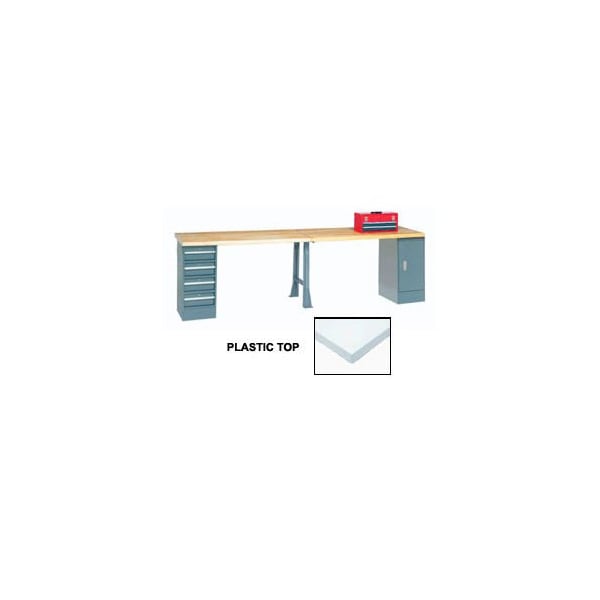 144inW x 30inD Production Workbench - Plastic Laminate Square Edge Top, Cabinet, 4 Drawer, 1 Leg, Gray. These extra long workbenches are built with durability in mind. Bench pedestals are 15-3/4inW x 20inD x 32inH featuring full length aluminum drawer pulls and smooth gliding nylon rollers. Drawer Inside Dimensions : 1st Drawer 13.23inW x 18.11inD x 4.33inH; 2nd Drawer 13.23inW x 18.11inD x 4.33inH; 3rd Drawer 13.23inW x 18.11inD x 4.33inH; 4th Drawer 13.23inW x 18.11inD x 4.33inH. Plastic - high pressure laminate w/particle board core 1-5/8in thick. Double electrical knockouts on legs. 144inW Benches include 2 72inW tops, 1 cabinet, 3 drawers and 1 leg frame.