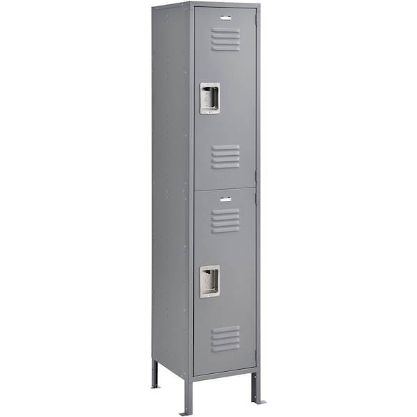 Door handle with fingertip lift latch is recessed into the door face to create a smooth catch-free surface, to discourage the padlock from being cut off and to provide a neat, clean look. The results are improved safety, security and appearance. These quality lockers feature 16 gauge steel doors, 5-knuckle security hinge and welded, reinforced frame-and-door assemblies. Extra wide louvers promote ventilation. Lockers must be anchored securely to floors. 1-wide and 3-wide lockers have four foot plates included. Foot plates bolt to outside locker leg supports and maybe anchored to the floor. Anchors sold separately. Legs add 6 to height. Includes blank number plates. Lockers have secure 2-point positive locking system, stainless steel door latch and double and single-prong coat hooks.