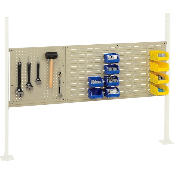 This mounting kit with pegboard and louver allow additional storage within easy reach of workbench area. The mounting kit includes one 18in pegboard and one 36in louver. This panel kit is ideal for 60inW workbenches. Uprights Sold Separately.