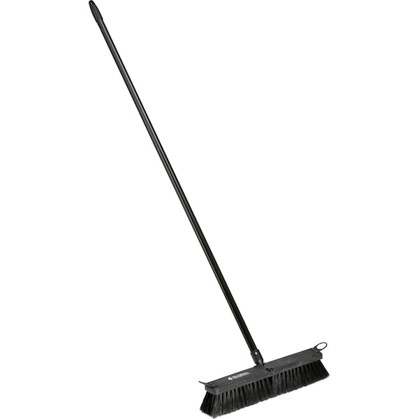 Built for industrial uses across a variety of construction worksites and rugged surfaces, the Global Industrial™ 18in Push Broom easily moves clusters of dirt, trash and debris across concrete and other hard textured floors. This fine sweep style broom is perfect for heavy duty sweeping demands at construction sites, warehouse floors and more. Solid, 60in steel handle with plastic coating is easy to grip and hold while applying force. Stiff 3in polypropylene threaded bristles provide durable strength to push and direct large volumes of rubble. Rigid construction reduces flexing. Standard dark black finish reduces footprints and scuffs. Slim, compact design is easy to store when not in use. Sold in package quantities of 4.