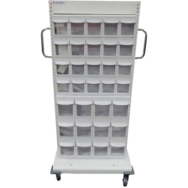 Safely store and transport medical supplies with the Global Industrial 2-Sided Medical Cart. Constructed from heavy-duty steel for long-lasting durability, this cart has a built-in workstation with a dedicated shelf for paperwork, laptop, or tablet storage. It easily maneuvers on four quiet casters, two of which are locking, and is equipped with corner bumpers to prevent damage. Built for versatility, this unit features (32) innovative flip-out bins in two different sizes, allowing you to tailor the cart to your specific needs. Assembly required.