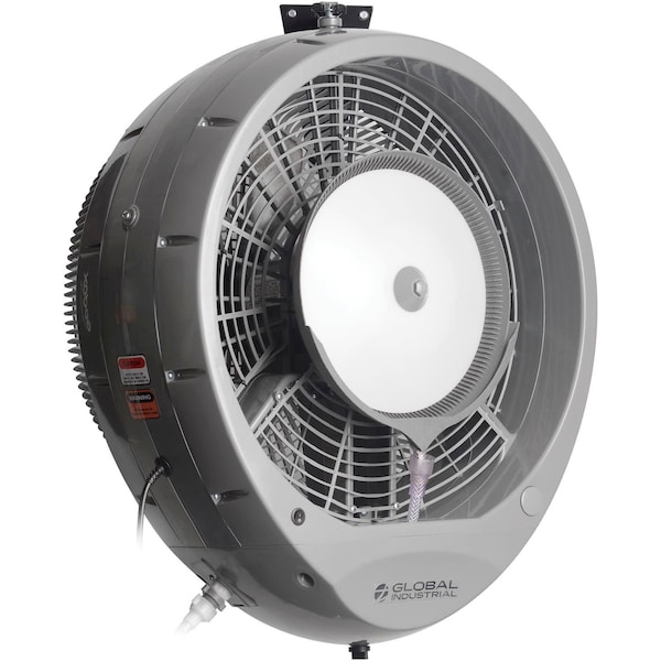 Atomizing creates a super fine mist that wonftt leave patrons wet. Reduces air temperature by 20°F. Can be used indoors or outdoors. Instantly transform uncomfortably hot rooms or crowded outdoor areas with the 29in Global Industrial#153; Wall Mount Atomizing Evaporative Cooler. Our unique coolers use state-of-the-art technology to produce a superfine mist, to cool the surrounding environment by nearly 20°F, using evaporative cooling principles. By utilizing atomizing technology, the water evaporates more quickly than traditional evaporative cooling technology. This process results in faster and more cost-effective cooling. Unlike traditional misting fans that leave you feeling wet, the atomizing process creates a water droplet so fine that users will stay dry. The volume of water mist is adjustable and any unused water is recycled back through the atomizing process once again. Designed to be plumbed for continuous cooling and no refilling necessary. Their low electrical and water usage makes this an economical choice for all your spot cooling needs. Wall bracket included. Additional Features: . 112,500 BTUfts of cooling using only 1.8 amps. 5,885 CFM. 115V, 9ft power cord. Cools up to 1,500 Sq Ft. Quiet operation, only 66dB. No media to replace.