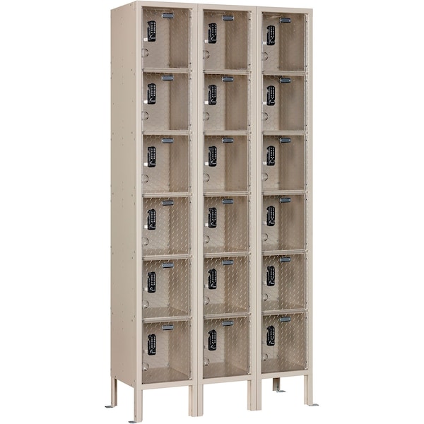 Scratch-resistant, transparent polycarbonate doors. Digital lock with keypad to keep belongings secure. Finger-pull friction hasp. Give your employees, students, and guests a secure place to store their belongings with this set of Global Industrial™ Clear View Lockers. Featuring scratch-resistant, transparent polycarbonate doors to permit the viewing of contents, this 6-tier, 18-door set of lockers is engineered specifically for use in schools, commercial buildings, factory facilities, and more. Its steel surface, with an attractive & durable powder coat finish, ensures a long service life while the digital lock keeps contents safe. No assembly required. Limited 1-Year Warranty. Includes blank locker number plates. Dimensions: 36inW x 12inD x 78inH. Lockers must be anchored securely to floors. Mounting anchors/hardware sold separately.