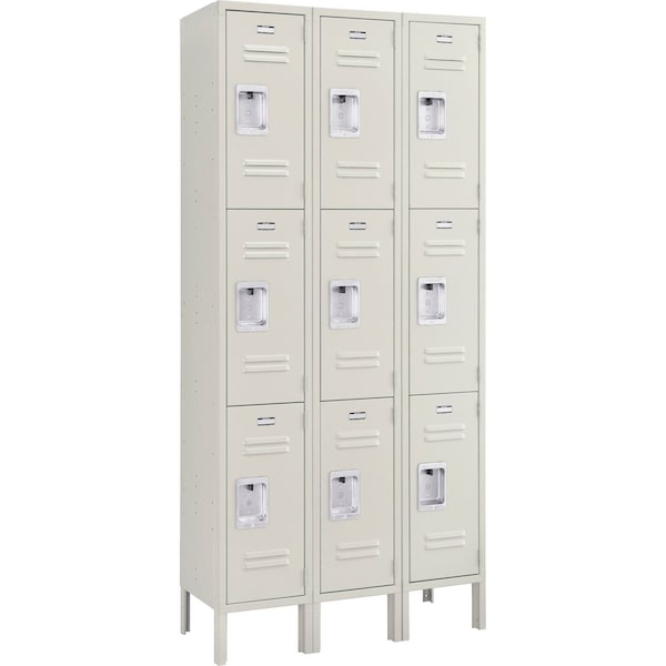 Features 16 gauge steel doors, 5-knuckle security hinge and welded, reinforced frame-and-door assemblies for maximum security. These triple tier lockers have a secure 2-point positive locking system and double and single-prong coat hooks. Generously sized louvers promote ventilation. Legs add 6 to height. Durable, attractive powder coat finish. Includes blank number plates. Lockers feature finished sides; no need for decorative end panels. Lockers must be anchored securely to floors. 1-wide and 3-wide lockers have four foot plates included. Foot plates bolt to outside locker leg supports and maybe anchored to the floor. Anchors sold separately.