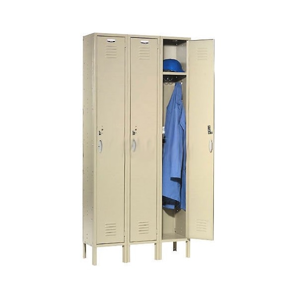 This single tier locker includes a hat shelf and double and single-prong coat hooks. Doors are styled with a catch-free recessed handle and padlockable friction hasp for quiet operation and ventilated with 2 sets of louversReinforced, welded frame-and-door assemblies ensure maximum security Durable powder coat finish resists wear and scratches for years of attractive service Lockers must be anchored securely to floors or walls 1-wide and 3-wide lockers have four foot plates included Foot plates bolt to outside locker leg supports and maybe anchored to the floor Optional Anchor Kits sold separately Legs add 6 to height Includes blank number plates Choose from tan or gray Optional locks, numbered plate kits and bases sold separately.