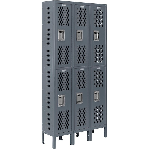 Lockers Combine Security, Visibility And Maximum Air Circulation For Gym, School, Warehouse And Breakroom Storage. Ventilated lockers are made using heavy 16 gauge steel with diamond shaped perforations for improved airflow. Locker doors feature rubber bumpers on framing to ensure quiet operation. Continuous piano hinges provide maximum security. Recessed handle and finger-lift control creates a clean, neat appearance. Lockers include blank number plates. Gray Powder coat color finishes. Steel lockers feature finished sides; no need for decorative end panels. Double Tier Steel Gym Lockers have secure 2-point positive locking system, stainless steel door latch and double and single-prong coat hooks. Legs add 6 to overall height.Optional locks and numbered plate kits sold separately.