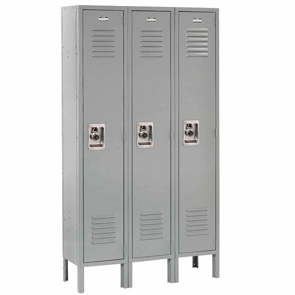 Used for use in schools and gym locker rooms. Door handle with fingertip lift latch is recessed into the door face to create a smooth catch-free surface, to discourage the padlock sold separately from being cut off and to provide a neat, clean look. The results are improved safety, security and appearance. These quality lockers feature 16 gauge steel doors, 5-knuckle security hinge and welded, reinforced frame-and-door assemblies. Extra wide louvers promote ventilation. Lockers must be anchored securely to floors or walls. Foot plates bolt to outside locker leg supports and maybe anchored to the floor. Optional Anchor Kits sold separately. Legs add 6 to height. Includes blank number plates. Lockers have secure 3-point positive locking system, hat shelf, stainless steel door latch and double and single-prong coat hooks the 18 deep model also includes a coat rod.