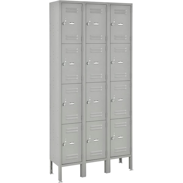 These lockers feature 16 gauge steel doors, 5-knuckle security hinge and welded, reinforced frame-and-door assemblies for maximum security. These four tier lockers feature a padlockable friction latch and hasp closure. Louvers promote ventilation. Legs add 6 to height. Durable, attractive powder coat finish. Includes blank number plates. Lockers feature finished sides; no need for decorative end panels. Lockers must be anchored securely to floors. 1-wide and 3-wide lockers have four foot plates included. Foot plates bolt to outside locker leg supports and maybe anchored to the floor. Anchors sold separately.