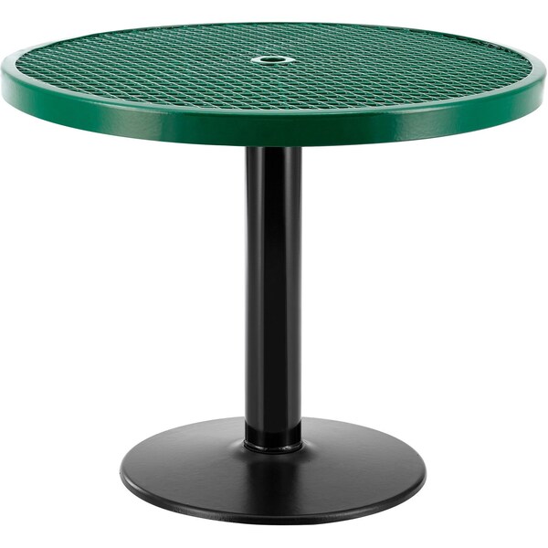 Outdoor portable tables are ideal for food courts, cafeterias, pavilions, patios, and more. Table tops are made using heavy-gauge expanded metal mesh with a thermoplastic coating. This protective coating creates a smooth, high-gloss surface that stays cool to the touch for comfortable seating even in the sun. Thermoplastic coating resists fading, mold and vandalism, and will ensure maintenance-free durability through years of high-traffic usage. Tabletop features an opening to accept an umbrella with a pole of up to 1-1/2in diameter. The sturdy pedestal base features a black textured powder coat finish that resists corrosion. Easy assembly. 1 Year Limited Warranty. Features: 36in round table top with thermoplastic finish. Table is 29in high. 4in tubular steel column. 21.6in diameter cast iron base with powder coat finish. Ultra-low maintenance. Tabletop accommodates up to 1-1/2in diameter umbrella pole. Portable mount.