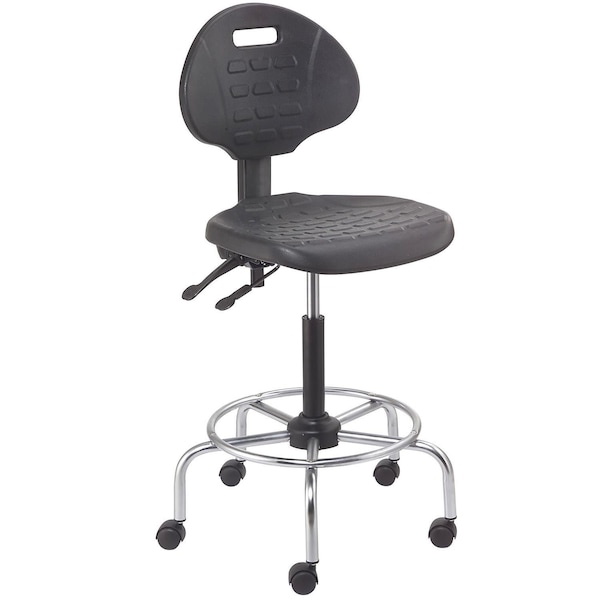 Puncture resistant polyurethane seat and backrestErgonomic adjustment controls360° foot ring Stable 5 blade base Hooded swivel casters Easy to clean Waterfall edge seat improves leg circulation Contoured back for lumbar support Easy assembly