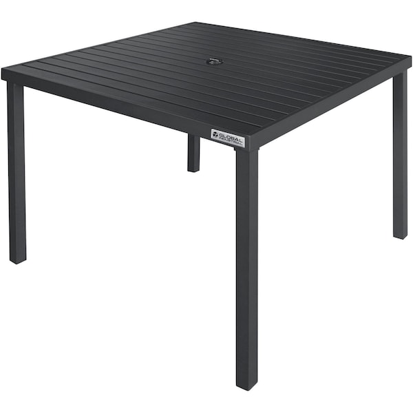 Upgrade your outdoor dining space with the Global Industrial; 40 Square Aluminum Slatted Dining Table. The table's sleek black finish is modern, easy to clean, and blends well into any dcor. Made of durable long-lasting aluminum this square table is ideal for use outside of restaurants, office buildings, and private home patios. Includes umbrella hole which accepts up to a 1-1/2 pole diameter. Some assembly required. Complete the look with the Global Industrial; Aluminum Slatted Dining Armchair 437006BK.