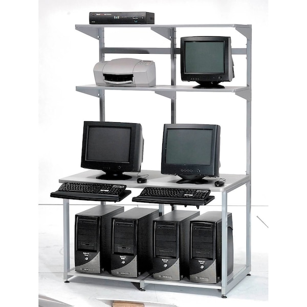 Global IndustrialTM LAN Workstation. These 16-gauge steel-reinforced stations features a 30inD work surface to handle even the largest monitors, leaving plenty of workspace. Plastic laminate work surface is 1-1/8in thick and ideally positioned at 29inH. Two top shelves 18-1/4inD are height adjustable on 2in increments. Lower shelf 27inD. Shelves are 3/4in thick plastic laminate. Each unit offers triple-leg support with four lateral braces for added stability. Braces offer built-in cable management. Gray powder coat finish. Easy assembly.