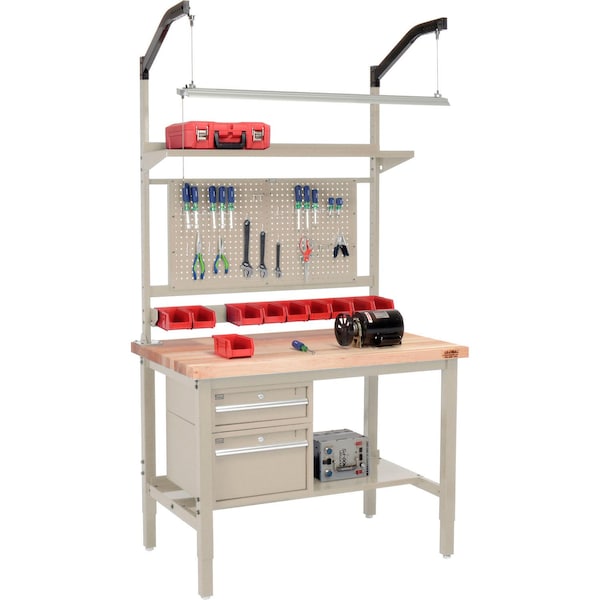 Square-edge maple Boos butcher block by John Boos & Co. High weight capacity to handle most projects and tasks Versatile configuration with power, drawers, lights, and more. Industrial workbench features rugged 2in square, 14 gauge tubular steel height adjustable legs. Legs adjust at 2in increments. Weight Capacity: 5000 lbs, evenly distributed. Bench Includes: 15inD Lower Shelf. 6inH Drawer. 12inH Drawer. 48inH Uprights. Bin rail. Pegboard Panel Mounting Kit. Cantilever Shelf. Led Light Kit with Arm Mount.