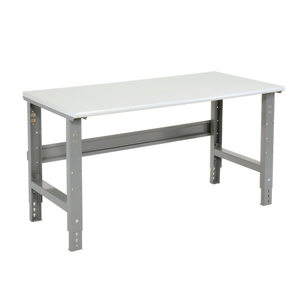 48inW x 30inD Adjustable Height Workbench C-Channel Leg - ESD Plastic Safety Edge - Gray. Conductive white plastic 1 1/4in thick top. Ideal when static electricity control is required. Properly grounded work surface rapidly bleeds off static build-up and prevents damage to sensitive electronic circuitry during assembly. Dissipates 5000 volt static charge in .01 seconds with surface resistance of 1010 Ohms. cleans easily with soap and water. Complies with MIL-B81705B and 101B, 101C, Method 4046. Adjustable height legs feature removable duplex knockouts on front and rear for installation of either a hard wired electrical outlet or an optional plug-in outlet that easily screws into place with no wiring necessary. Steel parts are gray powder coated. Bench stringer comes with mounting hardware to assemble legs to the bench top. Leg height adjusts in 1-1/2in increments.