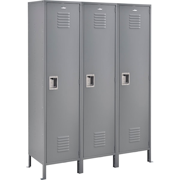 Door handle with fingertip lift latch is recessed into the door face to create a smooth catch-free surface, to discourage the padlock from being cut off and to provide a neat, clean look. The results are improved safety, security and appearance. These quality lockers feature 16 gauge steel doors, 5-knuckle security hinge and welded, reinforced frame-and-door assemblies. Extra wide louvers promote ventilation. Lockers must be anchored securely to floors. 1-wide and 3-wide lockers have four foot plates included. Foot plates bolt to outside locker leg supports and maybe anchored to the floor. Anchors sold separately. Legs add 6 to height. Includes blank number plates. Lockers have secure 3-point positive locking system, hat shelf, stainless steel door latch and double and single-prong coat hooks the 18 deep model also includes a coat rod.