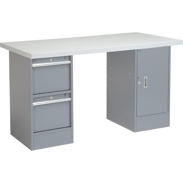 60"W x 30"D Workbench with 1-5/8" Thick Plastic Laminate Square Edge Top 2 Drawer/Cabinet. Pedestal workbench is made with strong, all welded steel that withstands tough industrial environments, and provides storage for any application. Pedestal drawers offer smooth drawer operation using nylon rollers and full-length aluminum handles. All drawers individually lock using cylinder locks for secure storage. Two drawers are 13.23"W x 18.11"D x 11.06"H. Cabinet includes an adjustable shelf, and a locking door with recessed handle and cylinder lock. Gray powder coat finish. Overall pedestal dimensions are 15-3/4"W x 20"D x 32"H.