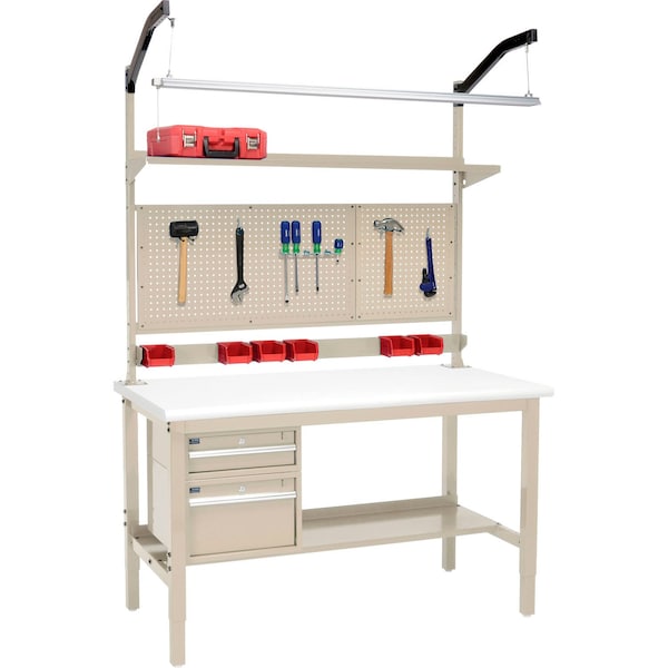 Heavy-Duty Complete Adjustable Height Production Workbench with Plastic Laminate Safety Edge Top. This industrial workbench features rugged 2in square, 14 gauge tubular steel height adjustable legs. Legs adjust at 2in increments. Weight Capacity: 5000 lbs, evenly distributed. Bench Includes: 15inD Lower Shelf. 6inH Drawer. 12inH Drawer. 48inH Uprights. Bin rail. Pegboard Panel Mounting Kit. Cantilever Shelf. Led Light Kit with Arm Mount.