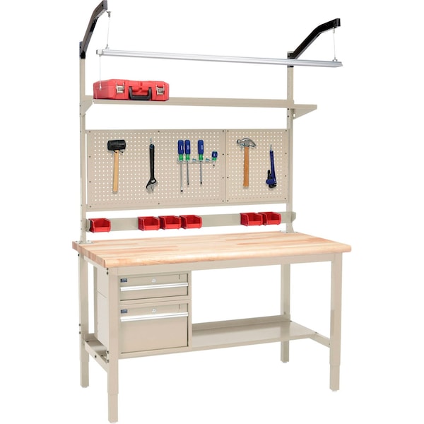 Rounded, safety-edge maple Boos butcher block by John Boos & Co. High weight capacity to handle most projects and tasks Versatile configuration with power, drawers, lights, and more. Industrial workbench features rugged 2in square, 14 gauge tubular steel height adjustable legs. Legs adjust at 2in increments. Weight Capacity: 5000 lbs, evenly distributed. Bench Includes: 15inD Lower Shelf. 6inH Drawer. 12inH Drawer. 48inH Uprights. Bin rail. Pegboard Panel Mounting Kit. Cantilever Shelf. Led Light Kit with Arm Mount.