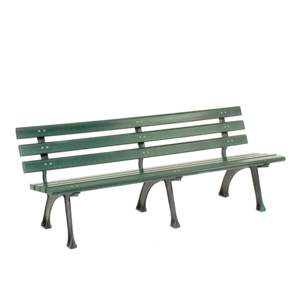 6ftL Park Bench With Backrest - Green - 240126. These benches have a hidden benefit; theyftre made from recycled wood and plastic composite thatfts super tough and UV, moisture and scratch resistant to endure outdoors for years with virtually no maintenance. This indoor/outdoor bench is ideal for parks and gardens. Black powder coated wrought iron legs support attractive green slats. Feet include anchor openings with predrilled hole diameter 0.457in. Stainless hardware. Predrilled slats for easy assembly. 1 Year Limited Warranty.