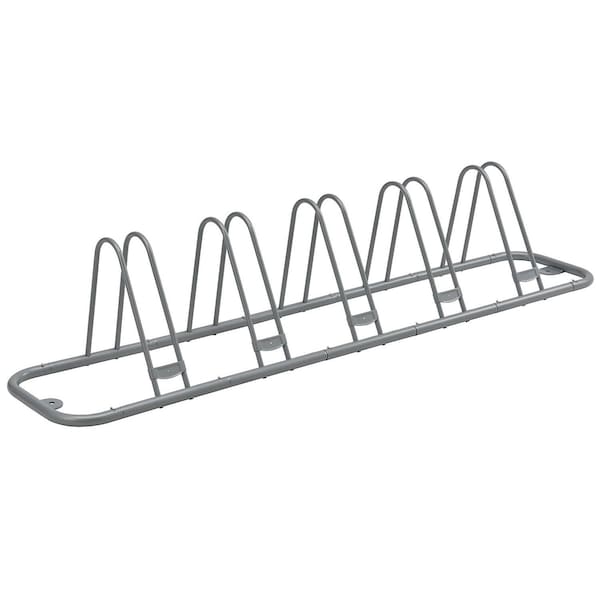 Single sided style has 5-bike capacity to secure bicycles in public and outdoor areas. Bikes are secured on one side and can be easily separated to reduce bicycle capacity. Includes 2 holes for varied fastening options or ground installation.