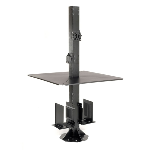 81inH Stationary Unit with VESA Mounts. This multi-user workstation is ideal for trade shows, factory floors, retails spaces or anywhere a secure, stable, extremely rugged computer kiosk is needed. Complete unit includes 4 work surfaces, 2 CPU holders, 81inH center post and 2 VESA universal flat panel screen mounts. All steel surfaces include a rugged, attractive powder coat finish. Easy assembly. The 4 steel work surfaces install around the center post to accommodate 4 users at once. Each trapezoid shaped surface is made of 14 gauge steel and measures 41-1/4inW x 19-1/4inD. Provides ample room for keyboard, mouse and other materials. Can be mounted at 30in or 40inH. The CPU/power supply holders adjust to hold items up to 9inW securely and include non-skid cushions to prevent marring. The super strong 5in x 5in steel center post with base bolts to the floor for stability hardware not included. To hide all cables, the post includes 3 cable management openings at 15in, 42-1/2in and 70inH. Post base measures 17-1/2in x 17-1/2in. The 2 VESA mounts, which accommodate any flat panel monitor from 10-30in, mount at 47in, 58in and 69inH. Mount permits monitor to tilt up 15° and down 5° easily and without tools to provide optimal viewing. Locks in place with a thumb screw. Additional CPU holders or VESA mounts are available, however they must be installed at staggered levels on the center post. Devices depicted in the images are not included.