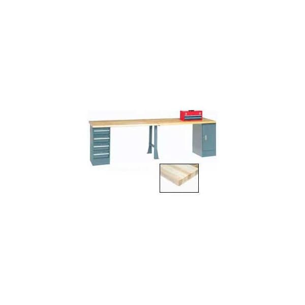 Square-edge maple Boos butcher block by John Boos & Co. High weight capacity to handle most projects and tasks Versatile configurate with extra workspace. 96inW x 30inD Extra Long Production Workbench - Maple Butcher Block Square Edge - Gray. These extra long workbenches are built with durability in mind. Bench pedestals are 15-3/4inW x 20inD x 32inH featuring full length aluminum drawer pulls and smooth gliding nylon rollers. Inside drawer dimension are 13inW x 17-3/4inD x 5-1/2inH. Maple Butcher Block - kiln dried 1-3/4in thick hardwood, mineral oil sealed. Double electrical knockouts on legs.
