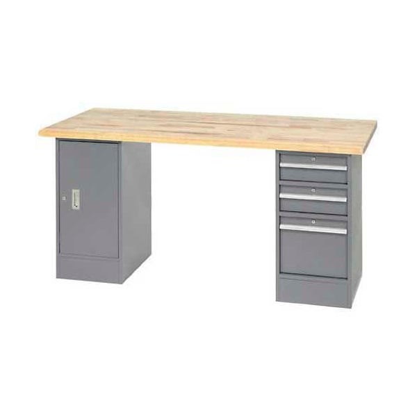 96 x 30 Pedestal Workbench, 2 Drawers and Cabinet, Maple Square Edge, Gray