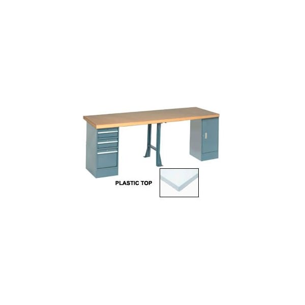96inW x 30inD Production Workbench - Plastic Laminate Square Edge Top, Cabinet, 3 Drawer, 1 Leg, Gray. These extra long workbenches are built with durability in mind. Bench pedestals are 15-3/4inW x 20inD x 32inH featuring full length aluminum drawer pulls and smooth gliding nylon rollers. Inside drawer dimension are 13inW x 17-3/4inD x 5-1/2inH 12inH on the lower drawer for the three-drawer pedestal. Plastic - high pressure laminate w/particle board core 1-5/8in thick. Double electrical knockouts on legs. Workbench includes 1 96inW top, 1 cabinet, 4 drawers and 1 leg frame.