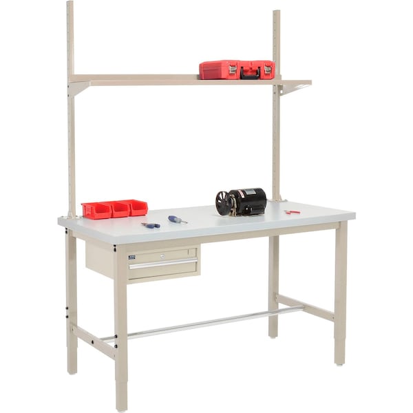 These production benches offer the same high quality construction as our heavy duty benches but with the added convenience of locking stackable drawers. Made with a 1-5/8in thick square edge gray plastic laminate top that resists stains moisture and scratches. High quality industrial workbench is built to last using rugged 2in x 2in x 14 gauge tubular steel height adjustable legs. Legs adjust at 2in increments. These workbenches are tested to 5,000 lb. capacity. 6inH drawer can be mounted to either left or right hand side under the counter top for lockable storage. Secures valuable tools, supplies and more using a cylinder lock with 2 keys. Drawer runs smooth on nylon rollers. Base includes a set of adjustable leveling floor glides and a set of leveling foot plates that allow floor anchoring. Powder coat finish. Quick and easy assembly. Bench Includes: Lockable Drawer. Upright Kit with Shelf.